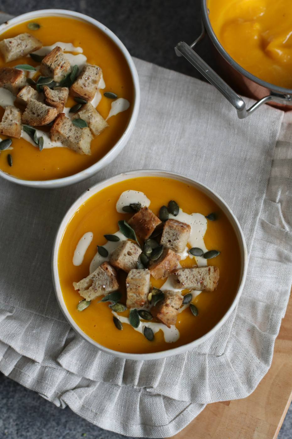 Mescoliamo un’ultima volta e siamo pronti a impiattare il tutto: io ho scelto di decorare la superficie con della panna extra, dei crostini (ovviamente!), qualche piccola fogliolina di salvia e dei semi di zucca. Ed ecco qui un piatto caldo e confortevole, perfetto per affrontare l’autunno.
